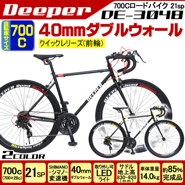 ■在庫のある出荷日について メーカー DEEPER 商品名 ロードバイク 700×28C 21sp 自転車 型番 DE-3048 サイズ(約) 700×28C 本体:W450×L1680mm フレーム:480mm ハンドル:890mm 梱包:W1620×H930×D220mm サドル高さ(約) 830?920mm 重量(N・W) 14.0kg シートポスト 25.4×250mm ピラータイプ 適正身長 160cm以上 適正体重 75kgまで 保険 PL保険加入済み 耐震試験 JIS耐振動試験合格品/フレーム 材質 フレーム:スチール リム:アルミ 変速シフター SHIMANO サムシフター ブレーキ ダブルピボット キャリパーブレーキ ハンドル・バー 420mmドロップハンドル(差し込み式) リム 700Cダブルウォール 40mm 対応バルブ 仏式(米式アダプター1個付属) 主な特徴 ・タイヤサイズ:700×28C ・カラースポーツサドル採用 ・カラーアウターケーブル採用 ・ボトルケージホルダー装備 ・LEDライト装備 ・米式バルブアダプター装備(1本)で空気入れも簡単 ・1本スタンド標準装備 ・フレームロゴ:ステッカー ※お届け時は梱包の都合上、前輪の向きが逆となっております。正しい向き(180度回転)にしてから組み立ててください。 付属品 LEDライト×1 米式アダプター×1 アーレンキー(5mm、6mm) +ドライバー ペダルレンチ 取扱説明書(販売証明書) メーカー希望小売価格はメーカーサイトに基づいて掲載していますDEEPER 700C ロードバイク DE-3048 700×28C シマノ21段変速 LEDライト装備 自転車 送料無料 SHIMANOデュアルコントロールレバー採用のアルミフレームモデルはこちら!! Lamborghini(ランボルギーニ) コンセプトカラーの赤と黒が鮮やかなブランドバイク! ▲高級感抜群!16インチの子供用自転車。子供でもクールでカッコイイ!! ▲アルミフレームの折畳みモデル。街乗りにうれしい6段変速&前後サスペンション搭載! ▲前後サスペンション搭載。街をアクティブに走行するマウンテンバイク! ▲軽量アルミフレームに充実装備。タウンスポーツタイプのクロスバイク! 自転車ご購入の注意事項 【3,000円(税抜)以上のお買物で送料無料】 ※ 自転車は沖縄および離島への販売および配送は行っておりません。 ※ 防犯登録は、お近くの「防犯登録協会加盟店」(ホームセンターなど自転車販売店舗)にてお願い致します。料金は各都道府県によっても異なりますが500円?1,000円が一般的です。 ※ 本製品はおよそ90%の完成済み状態でお届け致します(サドル・ハンドル・ペダルの取付・調整等が必要です)。 ※ 全ての車体は工場出荷時に点検・調整済みですが、運送時の振動などにより調整に狂いが生じる場合があります。そのため変速機、ブレーキについては購入後に再調整をお願いします。これらの調整は初期不良の対象となりません。 ※ お届けする車体のフレームには、配送時にキズが付かないよう出来る限りの梱包をしております。それでも配送中に小さなキズや出来てしまう場合が御座います。これは運送時の不可抗力と考えており、初期不良としての対象にはなりません。「通信販売」という性質をご理解頂き、予めご了承をお願い致します。 ※ 各数値は計測方法により異なる場合が御座います。 ※ 製品の色は、ご使用なるモニターや、その設定によって若干の違いが発生する場合が御座います。 ※ 製品改良のため予告なしに価格、色、デザイン、仕様などを変更する場合が御座います。