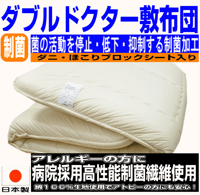 【あす楽_土曜営業】他社の抗菌布団とちょっと違うワンランク上の制菌敷布団♪ ドクターEs-O多層式極太敷布団は、 従来の抗菌加工の布団より さらに『病院採用高性能制菌繊維を使用』 高性能制菌機能となりました。 病院など医療機関などで広く使われいる高性能制菌繊維で 家庭で使えるように寝具技能士がでお仕立て企画しました。 商品についての詳細はこちらをクリック 病院採用 ほこりが出にくい高性能制菌中綿・清潔&安心 『アレルギーの方にお勧めの丸洗いOKの多層式極太敷き布団』 新企画の当店オリジナルの制菌敷き布団です (^^)v ハウスダスト、ダニ防止(防ダニ)、花粉症対策に最適です。 制菌(橙ラベル)とは、 抗菌(青ラベル)は表面上の細菌の増殖を抑制すること 制菌(橙ラベル)は微生物の活動を停止又は低下させ、 抗菌(青ラベル)より、制菌(橙ラベル)は数多く菌の増殖を抑えることができます。 抗菌(青ラベル)は抑制しますが、菌は少しずつ増えていきます。 制菌(橙ラベル)は活動を低下させるので、菌は減っていきます。 よって殺菌レベル(青ラベル)を比較すると制菌(橙ラベル)の方が格が上となります。 【制菌ドクターEs-O 布団の特 長(他社との違い)】 ●抗菌(SEK青ラベル)からワンランク上のバージョンUPした 高性能の制菌繊維【SEK橙ラベル】の水洗い可能な中わた使用 医療機関に使用するときは橙ラベルタッグを 布団に縫い付けております。 ●病院で使われている布団を 当社寝具技能士が家庭用に改善、 菌にも強くより安全・安心なお布団です。 科学が生んだ清潔さを是非実感してください。 ●『制菌ドクターEs』製造工程は他社と違い、 病院用寝具の製造工場で生産。 わたホコリが少なく、軽くて、安全・衛生的な特徴を備えています。 高密度生地使用でさらにダニ防止(防ダニ)効果UP! 綿100%生地を使用しているため、 アトピー、アレルギーの方にもお勧めです。 ●ダニ・ほこりをブロックする不織布シートを布団内部に装着し、 清潔で快適な眠りをお届けします。 ●布団のにおいが、気になる方 細菌やカビ類が原因。 細菌の増殖を防ぎ、悪臭の発生を防止、 清潔で快適な眠りをお届けします。 ●手仕上げでマットレスなしでも、柔らかすぎず硬すぎずちょうどよい寝心地 ●もちろん、日本製 市販のカバーでご使用可、ベッドでも使えます。 ●他に手に入らない寝具です。是非こちらでお求めください。 高性能制菌 極上手仕上げ!気持ちいい? セミダブル ダブル クィーン 掛布団 組布団 ベットにも使えます。 ヌードタイプ布団(白)となっております。 マットレスは不要です。 へたりを少なくするため、ポリエステル綿で圧縮、 硬質の多層式敷き布団に仕上げています。 ★送料、代引き手数料は無料です。 ★お支払いは、お振込み・クレジットでも対応させていただきます。 ★『送料別途』記載商品と同送の場合も、代引き手数料&送料は無料です。 ◆ レビューの書き込み方 ◆ ★ ご購入頂いた商品の「レビュー」は →こちらをクリック←から投稿できます^^ ☆ 「書き方がまだイマイチ分からないよ」というお客様は 『レビューの書き方、詳しくはこちらをクリック』をご覧下さいませ♪ 只今、ポイントUP!こちらをクリック さらに病院採用高性能制菌敷き布団お求めは!こちらをクリック 即納・指定日配送・時間帯指定・ポッキリ送料込・代引手数料無料・税込・あす楽対応商品【あす楽_土曜営業】です。 新婚新生活用・来客用・介護用家族用ファミリーサイズ・セミダブルロングサイズ・2段ベッド用・二段ベッド・フローリング用・ダブルベッド用 抗菌 消臭 防カビ 防ダニ加工 ダニ防止国産135×210 135×200 140×200オーダーメイドの敷き布団 敷布団セットもあります 布団丸洗いOK・ ウォッシャブルクリーニング洗える・極厚・極太・折れる・ 軽い固め(軽量硬め)のマットレス不要のへたりにくいオールシーズン対応合成 繊維マチ付き5層4層(四層 )新作固綿と無添加 綿100%生地使用 、ほこり ホコリ 埃 アレルゲンが少なくアレルギー方におすすめの高密度カバー、 熟睡 不眠症 腰痛ヘルニア 肩こり骨盤 矯正のための寝姿勢を重視しています。 ギフトにかわいい北欧柄のあったかシーツあたたかい敷布団カバー寝具セットふとんセットフトン蒲団ダブル4点セット8点セット等販売中! 楽天ランキング入賞品多数、特典安心高級品 、訳ありわけ有わけ特価割引アリアウトレットを数量限定ネット限定バーゲンSALE、 お試し福袋を超特価在庫処分! 激安50%OFF期間限定半額セール!開催中 大人気最高評価 No.1 ランキング品等取り揃えています。 <取り扱い商品>v lap アレルバスター ミクロガード トゥルースリーパー ムアツ布団(むあつしきふとん)ミクロガード ダニゼロック高反発 低反発 <取り扱い繊維>アクフィットECO ウォシュロン ケパック フィルハーモニィ 東洋紡ブレスエアー 東レマッシュロン アルファイン マイティートップ ウール 羊毛 インビスタアクア ホロフィル クォロフィル <取り扱いメーカ