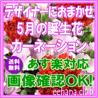 ギフト対応 ■PM3時までのご注文であす楽対応!■ ■お届け画像の確認が出来ます■ ■フラワーデザイナーにおまかせの人気のシリーズです ※イメージを選ぶこともできます お好きな色・イメージをチョイスしてください ========================= 品質保証について ================================ いいHana倶楽部では大切なお客様へのお届けに際し、細心の注意を払って作成、梱包 しておりますが、万が一「花折れ・花枯れ・凍み」等ございましたら同等品をご用意して 再送させて頂きます♪ ※お花は生きておりますのですべてのお花が整った形をしているとは限りません。 またお取扱いには十分注意しておりますが、たいへんやわらかくやさしいものですので 花業界、花市場の常識の範囲内での多少の傷み等はご理解頂ければと思います。 ============================================================================ ■メッセージカードをご希望の場合は【買い物かご】に記入欄がありますのでご記入ください 5月の誕生花は カーネーション(純粋な愛情・愛を信じる)です ■写真付きのメッセージカードを付けて贈ることが出来ます 【300円追加】 ※追加の場合金額が表示されませんが受注後、金額を訂正してご案内いたします ■四つ葉のクローバーの押し花メッセージボトルにメッセージを入れて贈ることが出来ます お選びください【300円追加】 ※追加の場合金額が表示されませんが受注後、金額を訂正してご案内いたします。 ■5月の誕生花の花言葉カードをお付けします ※5月の季節のお花を入れて作成しますがデザイン上それ以外のお花も入ります また、誕生日当日のお花が必ず入るわけではありませんので予めご了承下さい