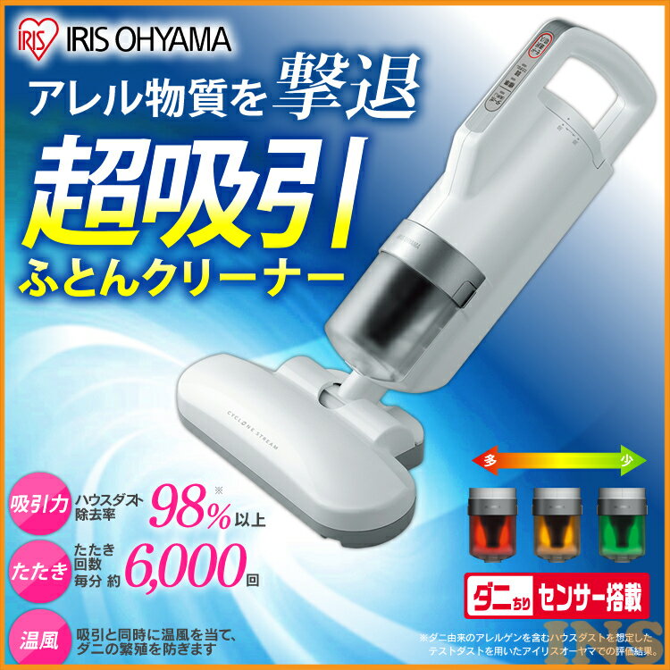 ■使用時サイズ(cm) 幅約25×奥行約45.9×高さ約21.2 ■収納時サイズ(cm) 幅約25×奥行約14.4×高さ約40.3 ■超ワイドたたきパッド 約20cm ■重量 約1.6kg(電源コード含む) ■電源 AC100V(50/60Hz) ■消費電力 400W ■コードの長さ 約4m ■振動回数 毎分約6000回 ■集塵容量 約0.2L ■セット内容 掃除機本体、集じんフィルター(本体に取り付け済み)、排気フィルター(本体に取り付け済み)、コードバンド(本体に取り付け済み) 軽くて、パワフルなふとんクリーナー。 業界最軽量クラス1.6kg(※2016年5月現在。日本国内の布団専用掃除機において。) ダニちりセンサー搭載で、ダニ・ちりなどの量をランプでお知らせ。 吸引+たたきでアレル物質を撃退。 吸引と同時に温風でふとんをふっくら温めて、ダニが繁殖しにくい環境を作ります。 可動式で操作もスムーズ。 スタンドなしで収納できる自立式。 水洗いできるから、いつでも清潔。 ◆吸引 ヘッドの内部でサイクロン気流を発生させハウスダストをかき出して吸い取ります。 ハウスダスト除去率3分間えで98%以上。 (※ダニ由来のアレルゲンを含むハウスダストを想定したテストダストを用いた社内基準での評価結果。) ◆たたき 高速振動で繊維の間に潜むダニやゴミを浮き上がらせます。(たたき約6000回/分)