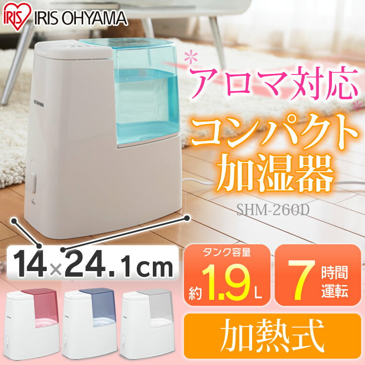 どんな場所にも置けるスリムデザインで、デスクやリビングテーブル上にスッキリ置ける加熱式加湿器です。 カラーは4色展開で、子供部屋や書斎などを加湿するのに対応できます。 アロマトレー付で、アロマオイルを入れて香りを楽しむことができます。●商品サイズ(cm):幅約14×奥行約24.1×高さ約26(コード含まず) ●重量:約1.2kg ●材質:ABS樹脂、ポリプロピレン ●加湿方法:加熱式 ●電源:AC100V(50/60Hz) ●消費電力:210W ●最大加湿量:約260ml/h ※1 ●加湿時間:約7時間 ●適用床面積木造和室:約4畳プレハブ洋室:約7畳 ●タンク容量:約1.9L ●電気代:1時間当たり約5.7円 ※2 ※1:加湿量は、室内20℃、湿度約50%の場合の目安です。 ※2:電気代は1km/hあたり27円を目安に計算した場合です。 ●カラー:グリーン 、ブルー 、ピンク、クリア