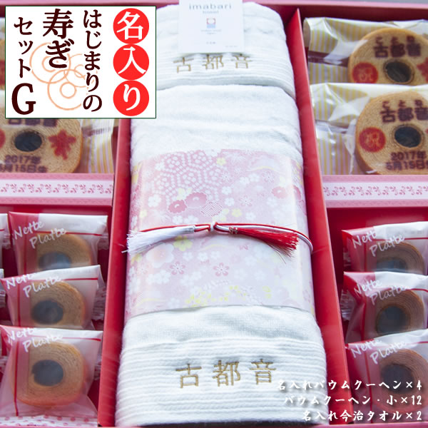 商品イメージ左の画像が商品画像です。クリックして頂くとより大きな画像をご覧になれます。セット内容名前入りバウムクーヘン×4バウムクーヘン・小(プレーン)×6バウムクーヘン・小(いちご)×6名前入り今治タオル(フェイスタオル)×1名前入り今治タオル(ウォッシュタオル)×1箱サイズ約370×460×50mm商品サイズ名前入りバウムクーヘン:直径:約8.2cm・高さ:約1.5cmバウムクーヘン・小:直径:約4.5cm・高さ:約1.5cm焼き具合により多少前後する場合がございます。名前入り今治タオル(フェイスタオル):約84×34cm名前入り今治タオル(ウォッシュタオル):約35×34cm今治タオル(フェイスタオル・ウォッシュタオル)のお名入れご希望のお名前を画像で記した位置へ、ゴールドの刺繍糸でお入れいたします。漢字、ひらがな、カタカナ、アルファベットに対応いたします。お入れするお名前がバウムクーヘンと別のお名前の場合でも承ります。その際は備考欄へバウムクーヘン、今治タオルそれぞれのお名入れ内容のご指示をお願いいたします。お名入れご不要でも承ります。バウムクーヘンのお名入れ「名前」「ふりがな」「生年月日(西暦)」をお入れいたします。5文字以内、漢字、ひらがな、カタカナ、アルファベットに対応いたします。ひらがな、カタカナ、アルファベットの場合は、ふりがなは入りません。名入れに使用しているインクは食品衛生法をクリアした可食インクを使用しております。原材料表示に関しましては法令上、添加物の扱いになるため、着色料(食用赤色102・106・青色1・黄色4)と表示しております。お名入れご不要でも承ります。お名入れご不要の際は、お名前・生年月日ご不要で絵柄のみのパターンか、無地のバウムクーヘンのいずれかをお選びください。名前入りバウムクーヘンについて《素材(原材料)》鶏卵、砂糖、小麦粉、マーガリン、植物油脂、乳主原料、牛乳、希少糖含有シロップ、コーンスターチ、果糖ブドウ糖液糖、水あめ、食塩、寒天、ソルビトール、乳化剤、膨張剤、香料、酒精、脂肪酸、セルロース、増粘剤(キサンタン)、ホエイソルト、トレハロース、酸味料、着色料(カロテン,ベニコウジ,食用赤色102・106・青色1・黄色4P)《アレルギー物質》小麦、卵、乳《賞味期限》約30日《原産国》日本バウムクーヘン・小(プレーン)について《素材(原材料)》鶏卵、砂糖、小麦粉、マーガリン、植物油脂、乳主原料、牛乳、希少糖含有シロップ、コーンスターチ、果糖ブドウ糖液糖、水あめ、食塩、寒天、ソルビトール、乳化剤、膨張剤、香料、酒精、脂肪酸、セルロース、増粘剤(キサンタン)、ホエイソルト、トレハロース、酸味料、着色料(カロテン)《アレルギー物質》小麦、卵、乳《賞味期限》約30日《原産国》日本バウムクーヘン・小(いちご)について《素材(原材料)》鶏卵、砂糖、小麦粉、マーガリン、植物油脂、乳主原料、牛乳、希少糖含有シロップ、コーンスターチ、果糖ブドウ糖液糖、水あめ、苺、食塩、寒天、ソルビトール、乳化剤、膨張剤、香料、酒精、脂肪酸、セルロース、増粘剤(キサンタン)、ホエイソルト、トレハロース、酸味料、着色料(カロテン,ベニコウジ,コチニール)《アレルギー物質》小麦、卵、乳《賞味期限》約30日《原産国》日本今治タオルついて《素材(原材料)》綿100%《内容》フェイスタオル・ウォッシュタオル《原産国》日本納期3?4営業日程度での発送となります。(※同梱商品がある場合はこの限りではありません)(※数量が多い場合はこの限りではありません。)(※前入金決済をお選びの場合はご入金確認後からのお手配となります。)(※ご注文内容に確認事項のある場合はこの限りではありません。)(※写真入りカードをお選びいただいた場合はお写真の送付をお待ちするため、この限りではありません。)重要事項お客様からのご注文に応じてオーダーメイドでお名前をお入れする関係上、注文内容のご変更やキャンセルにつきましては、弊店からの受注確認メールの送信をもって締切とさせていただきます。それ以降のご変更やキャンセルは一切お受けできません。あらかじめご了承の上、ご注文くださいませ。注意事項直射日光・高温多湿を避けてください。焼き菓子の特性上、色、大きさ、形にバラつきがございます。あらかじめご了承くださいませ。のし・ラッピングおのし、ラッピング共に無料サービスです。包装紙でラッピングいたします。※包装紙不要、もしくはご自宅用のご指示がない際はラッピングいたします。カード命名カード、メッセージカード(ギフトカード)、ウェディングカードを無料でご用意いたします。利用例出産内祝 出産内祝い 内祝い お返し 出産祝いのお返し お支払い方法につきまして コンビニ決済、銀行振込でのお支払いの場合はご入金確認からの手配となりますので、通常納期以上にお時間を頂戴する場合がございます。お急ぎのお客様はクレジットカード決済、代金引換をお選び下さい。なお、お支払い総額が12000円を超える場合は代
